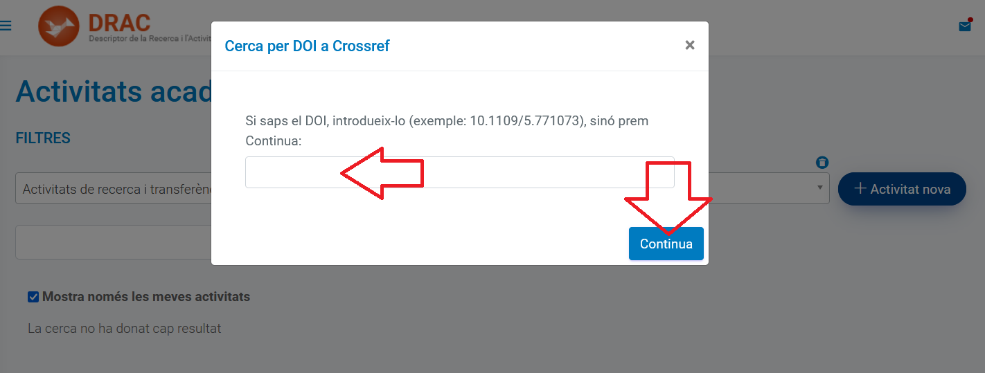 2) Si sabem el DOI del Dataset que volem donar d'alta a DRAC, l'enganxem al requadre i premem el botó "Continua", d'aquesta manera les dades del Dataset s'integraran automàticament del Crossref al formulari de DRAC i si no sabem el DOI , el Dataset no té DOI o les dades no s'han localitzat a Crossref, directament premem sobre el botó "Continua" per a que se'ns obri el formulari d'alta del Dataset: