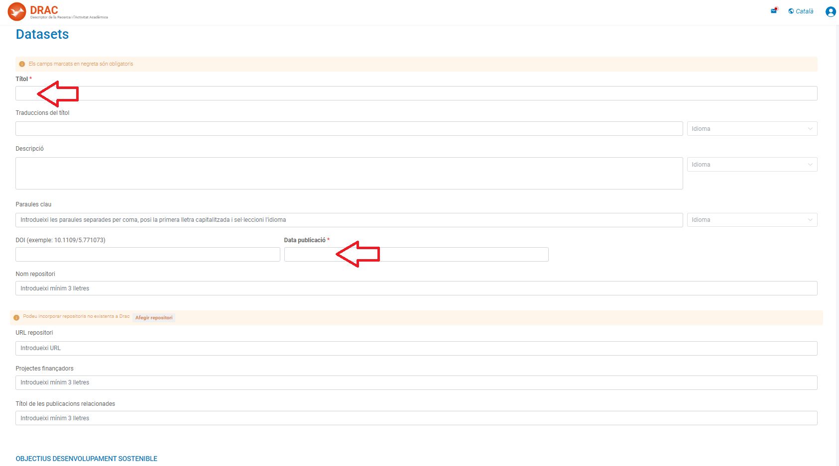 3) Una vegada s'obre el formulari d'alta del Dataset a DRAC, afegim la informació dels camps obligatoris, és a dir, el "Títol" i la "Data de publicació":