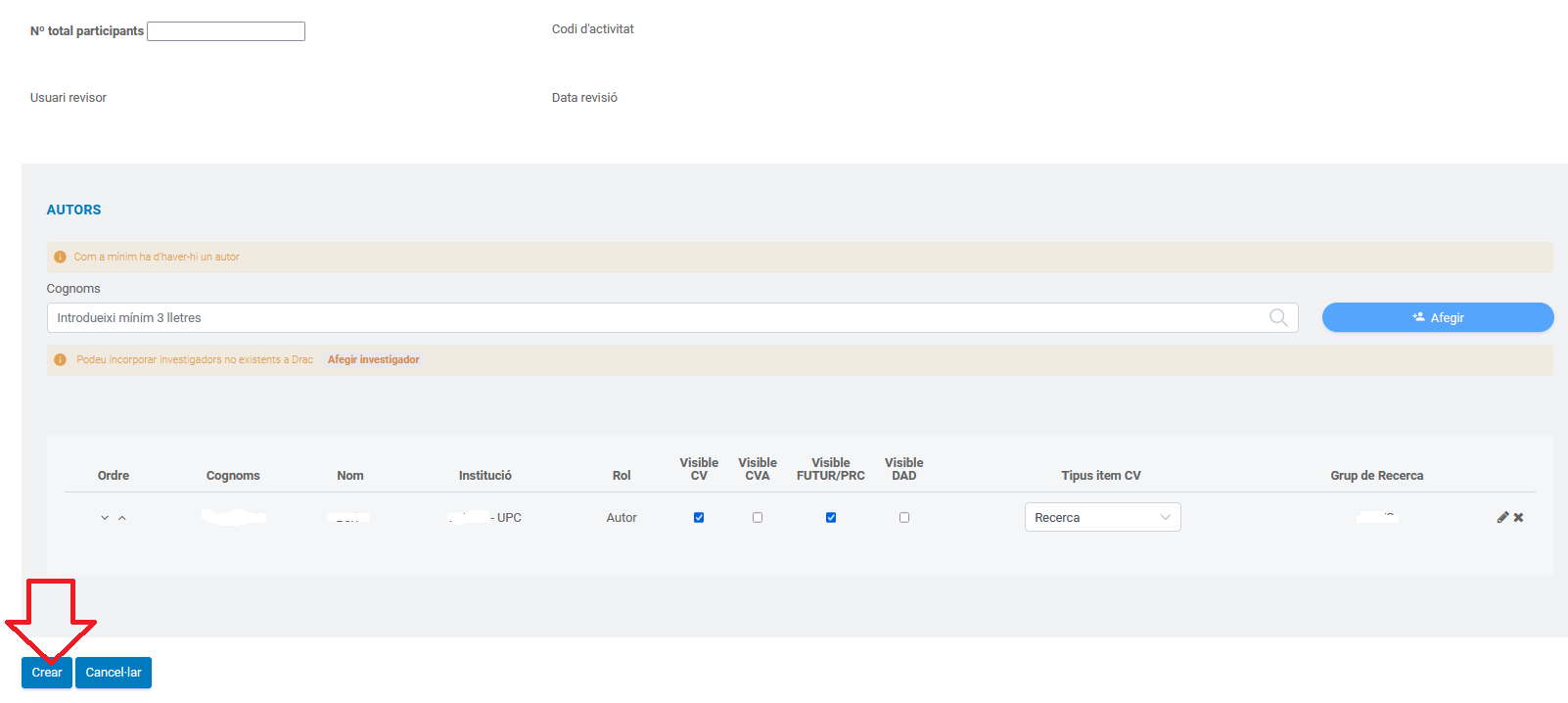 4) Comprovem que DRAC ens hagi afegit com a coautors del Dataset al final del formulari i premem el botó de "Crear" just a sota per tal que se'ns creï el Dataset: