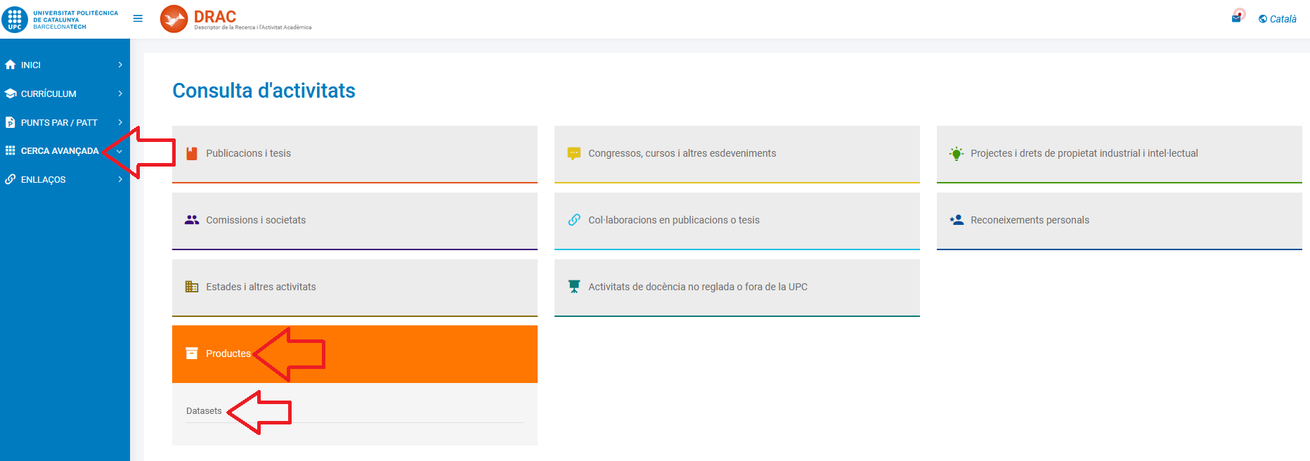 O bé, fem servir la opció de "Cerca avançada" del menú de l'esquerra de DRAC i a l'arbre d'activitats que s'obre, cliquem sobre l'apartat de "Productes", que és d'on penja la nova tipologia d'activitat "Dataset"; cliquem a sobre: